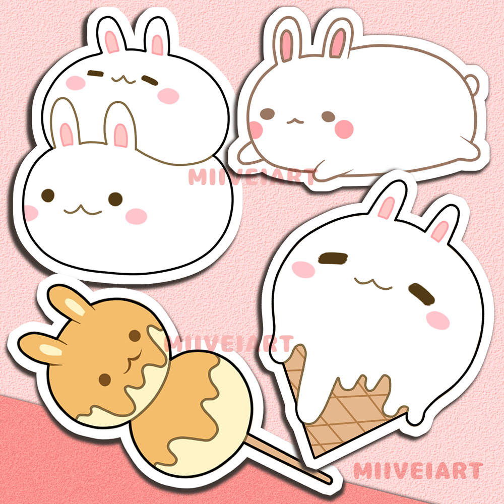 Waterproof and weatherproof vinyl sticker of snack-themed bunnies! They are approximately 3x3 inches.