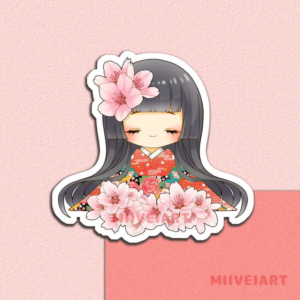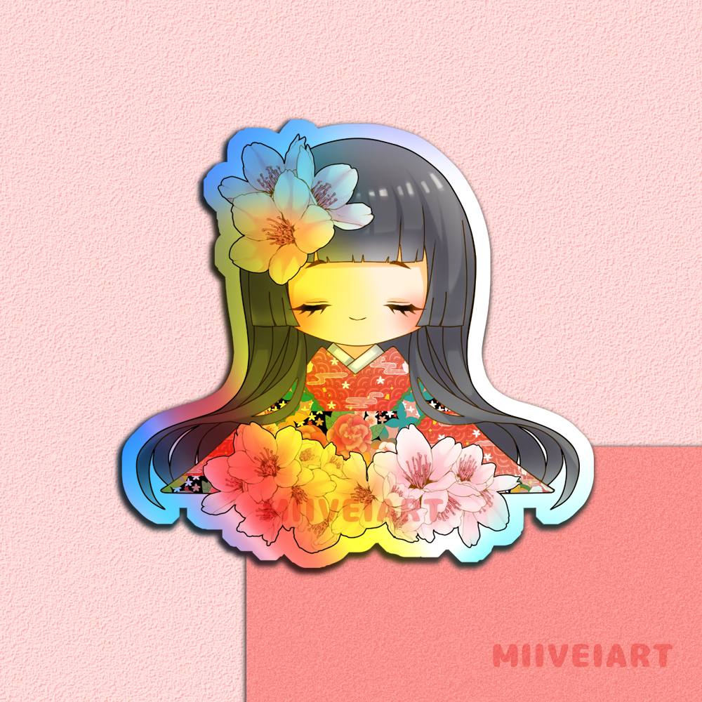 Waterproof and weatherproof vinyl sticker of original character, Blossom Girl! It comes in Holographic or white vinyl. It is approximately 3x3 inches.