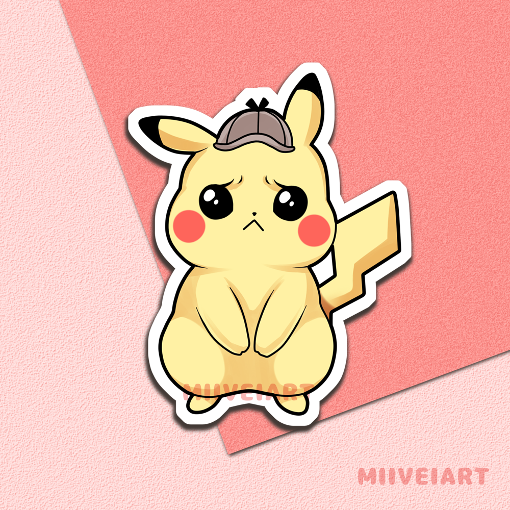 Waterproof and weatherproof vinyl sticker of detective pikachu! They are approximately 3x3 inches.