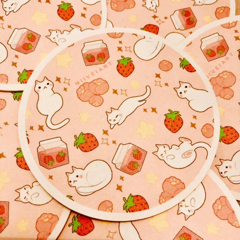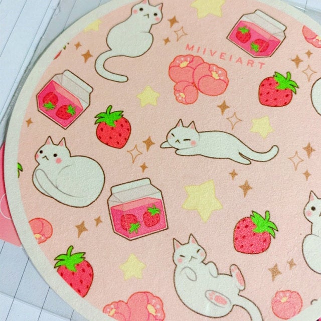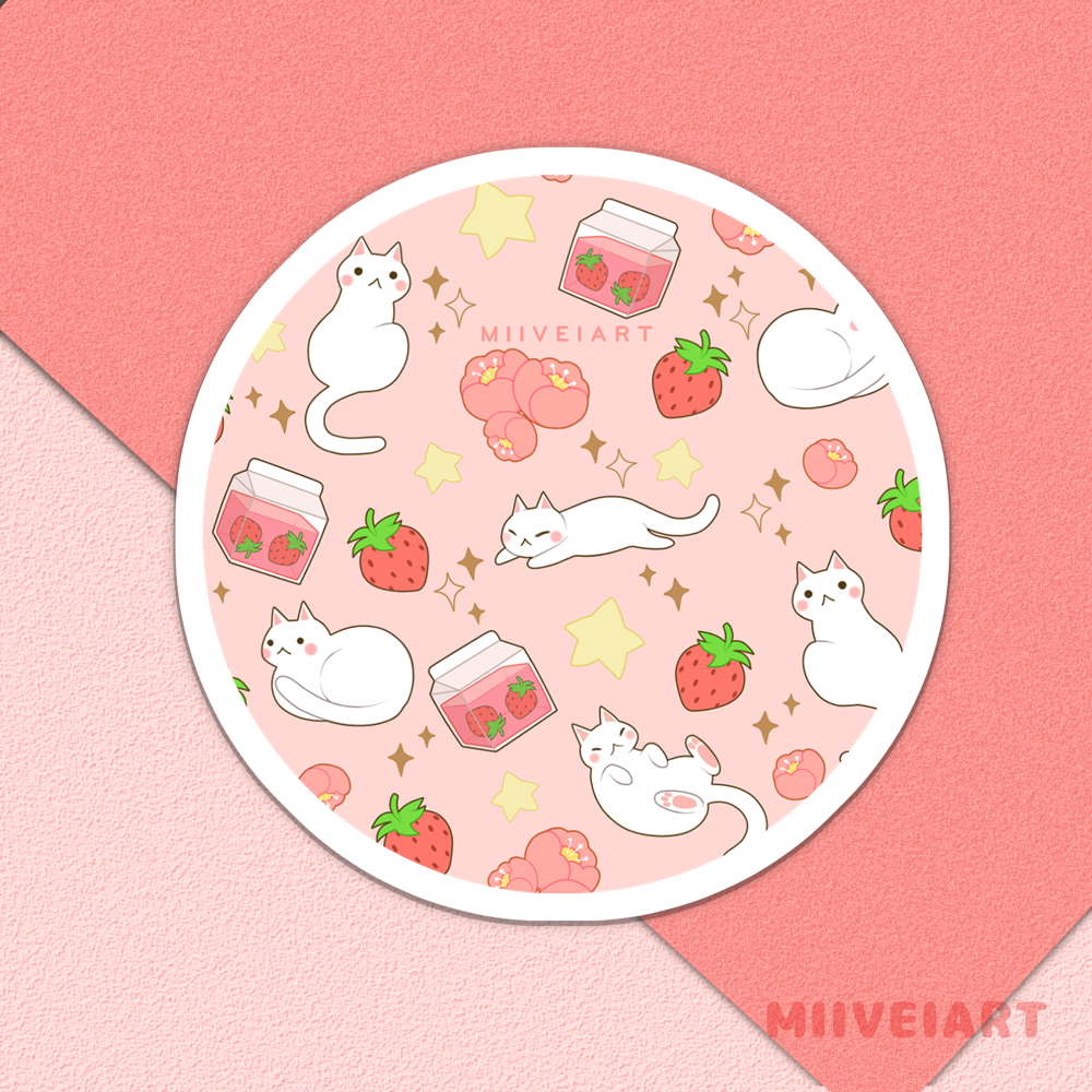 My strawberry milk & Kitties design printed in full color on 60 pt. coaster board, our coasters will soak up condensation and keep your table dry for the next round. Printed in full color on thick, premium coaster board and cut precisely into a 3.7" circle.